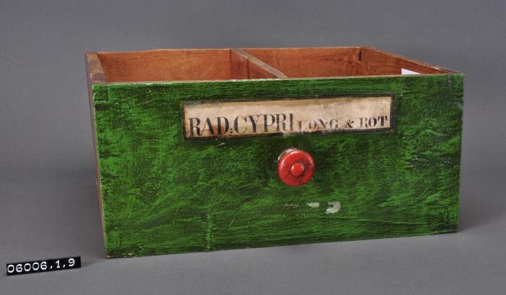 Schublade aus Nadelholz mit rotem Knauf und gezinkten Verbindungen (Schwalbenschwanzverbindung). Boden angeleimt und mit Holznägeln gesichert. Mittiger Abteiler. Vorderfront grün mit aufgeklebter Papiersignatur. Enthielt Cypernwurzel, auch wilder Galgant genannt.