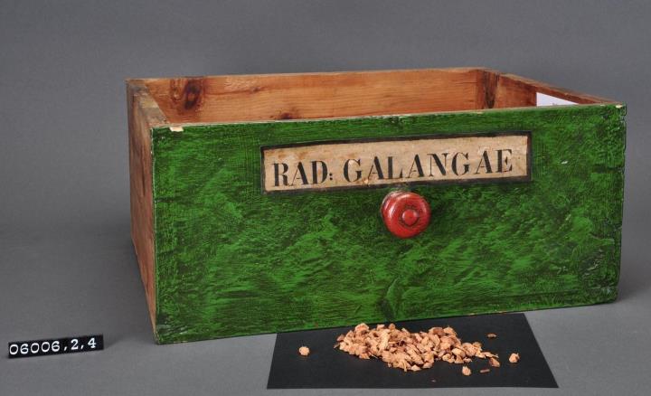 Schublade aus Nadelholz mit rotem Knauf und gezinkten Verbindungen (Schwalbenschwanzverbindung). Boden angeleimt und mit Holznägeln gesichert. Vorderfront grün mit aufgeklebter Papiersignatur. Enthält Galgant-Wurzel geschnitten.