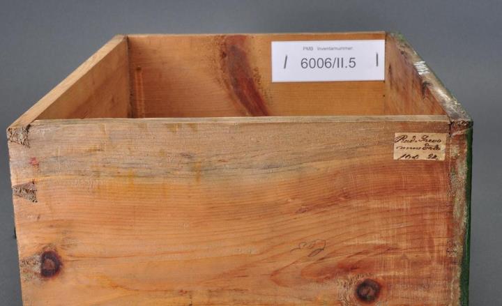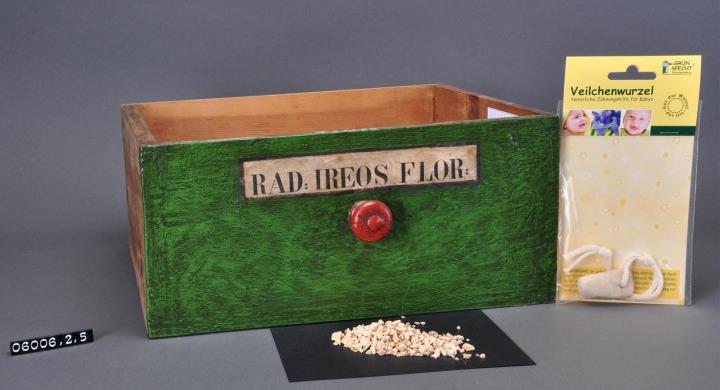 Schublade aus Nadelholz mit rotem Knauf und gezinkten Verbindungen (Schwalbenschwanzverbindung). Boden angeleimt und mit Holznägeln gesichert. Vorderfront links abfallend, grün mit aufgeklebter Papiersignatur. Seitlich altes preisschild. Enthält Veilchenwurzel geschnitten, sowie eine ganze Beißwurzel, original verpackt.