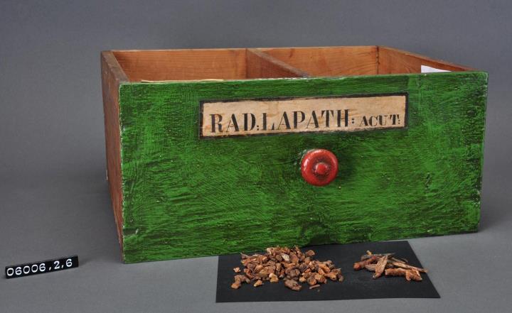 Schublade aus Nadelholz mit rotem Knauf und gezinkten Verbindungen (Schwalbenschwanzverbindung). Boden angeleimt und mit Holznägeln gesichert. Mittiger Abteiler. Vorderfront grün mit aufgeklebter Papiersignatur. Enthält Ampfergrindwurz.
