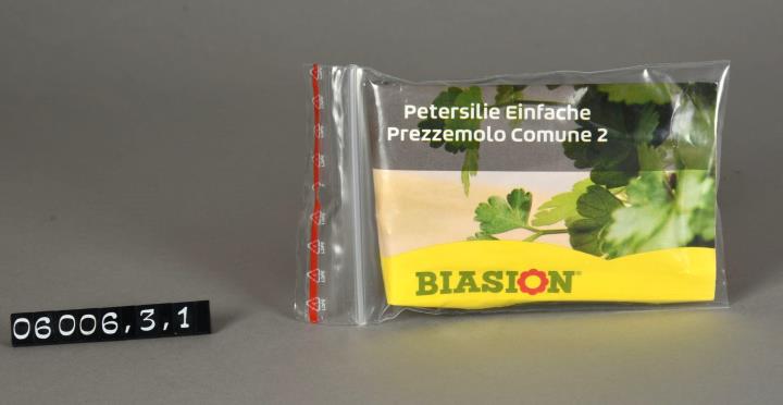 Schublade aus Nadelholz mit rotem Knauf und gezinkten Verbindungen (Schwalbenschwanzverbindung). Boden angeleimt und mit Holznägeln gesichert. Vorderfront grün mit aufgeklebter Papiersignatur. Enthält Petersilien-Wurzel geschnitten, Wurzel ganz und Petersilien-Früchte- bzw.-Samen.