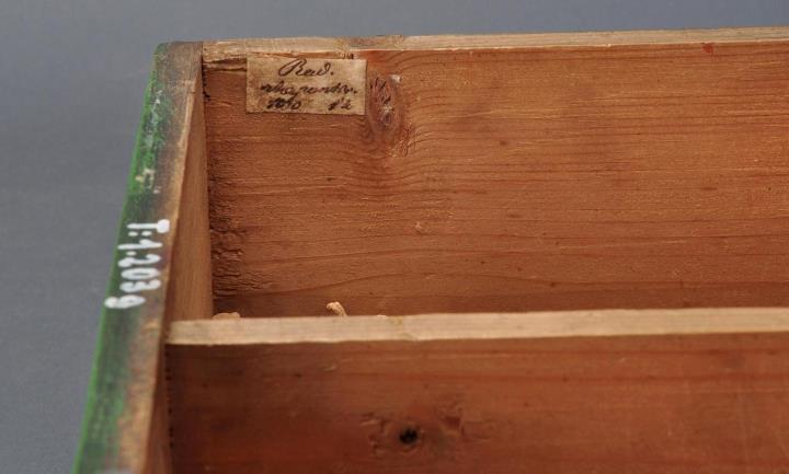 Schublade aus Nadelholz mit rotem Knauf und gezinkten Verbindungen (Schwalbenschwanzverbindung). Boden angeleimt und mit Holznägeln gesichert. Mittiger Abteiler. Vorderfront grün mit aufgeklebter Papiersignatur. Innenseite Seitenteil altes Preisschild. Enthält Rhapontik-Wurzel, geschnitten auch falscher Rhabarber oder sibirischer Rhabarber genannt.