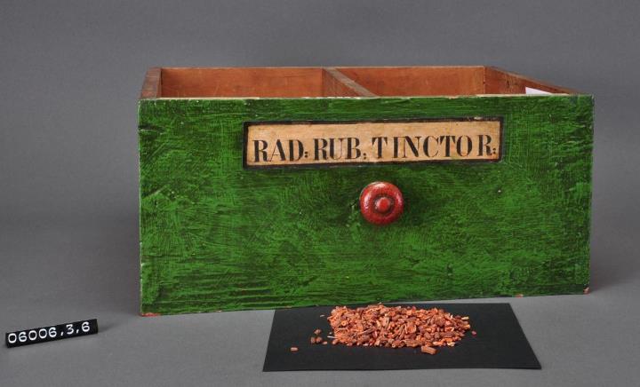Schublade aus Nadelholz mit rotem Knauf und gezinkten Verbindungen (Schwalbenschwanzverbindung). Boden angeleimt und mit Holznägeln gesichert. Mittiger Abteiler. Vorderfront grün mit aufgeklebter Papiersignatur. Enthält Krapp-Wurzel oder Färberröthe geschnitten.
