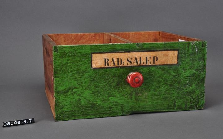 Schublade aus Nadelholz mit rotem Knauf und gezinkten Verbindungen (Schwalbenschwanzverbindung). Boden angeleimt und mit Holznägeln gesichert. Mittiger Abteiler. Vorderfront grün mit aufgeklebter Papiersignatur. Enthielt Salep-Wurzel, auch Ragwurz genannt.