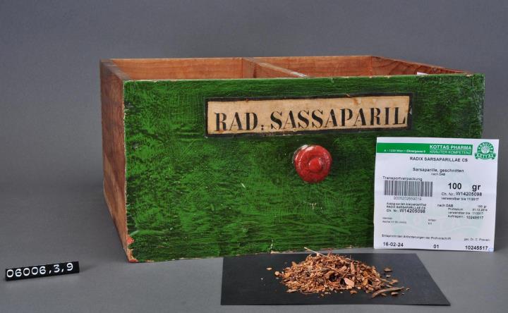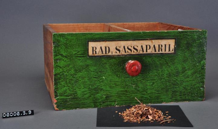 Schublade aus Nadelholz mit rotem Knauf und gezinkten Verbindungen (Schwalbenschwanzverbindung). Boden angeleimt und mit Holznägeln gesichert. Mittiger Abteiler. Vorderfront grün mit aufgeklebter Papiersignatur. Enthält Sarsaparill-Wurzel oder Salsaparille geschnitten.