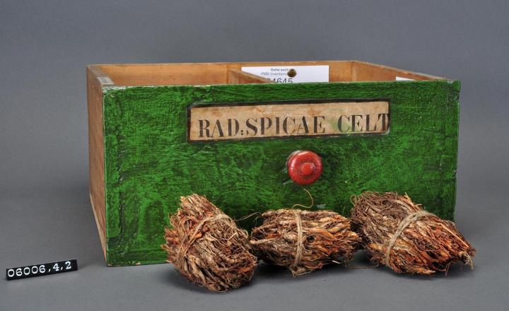 Schublade aus Nadelholz mit rotem Knauf und gezinkten Verbindungen (Schwalbenschwanzverbindung). Boden angeleimt und mit Holznägeln gesichert. Mittiger Abteiler. Vorderfront grün mit aufgeklebter Papiersignatur. Enthält Speik, oder Nardenwurzel als Ganzdroge in 9 Bündeln.