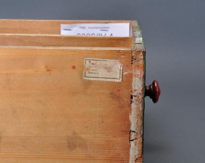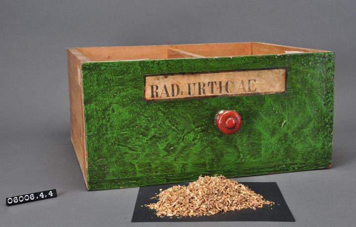 Schublade aus Nadelholz mit rotem Knauf und gezinkten Verbindungen (Schwalbenschwanzverbindung). Boden angeleimt und mit Holznägeln gesichert. Mittiger Abteiler. Vorderfront grün mit aufgeklebter Papiersignatur. Enthält Brennesselwurzel, geschnitten.