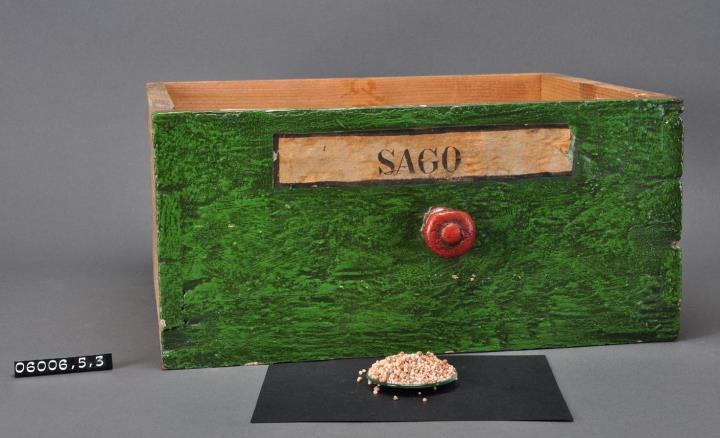Schublade aus Nadelholz mit rotem Knauf und gezinkten Verbindungen (Schwalbenschwanzverbindung). Boden angeleimt und mit Holznägeln gesichert. Mittiger Abteiler. Vorderfront grün mit aufgeklebter Papiersignatur. Enthält Sago-Stärke, Perlsago.