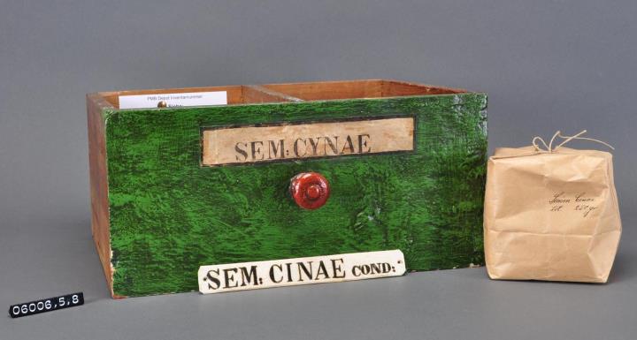 Schublade aus Nadelholz mit rotem Knauf und gezinkten Verbindungen (Schwalbenschwanzverbindung). Boden angeleimt und mit Holznägeln gesichert. Mittiger Abteiler. Vorderfront grün mit aufgeklebter Papiersignatur. Enthält eine alt beschriftete Tüte mit Wurmsamen sowie ein historisches Schubladenschild aus Blech.