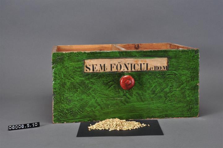 Schublade aus Nadelholz mit rotem Knauf und gezinkten Verbindungen (Schwalbenschwanzverbindung). Boden angeleimt und mit Holznägeln gesichert. Mittiger Abteiler. Vorderfront grün mit aufgeklebter Papiersignatur. Enthält römischen Fenchel .