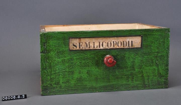 Schublade aus Nadelholz mit rotem, teilweise abgesprungenem, Knauf und gezinkten Verbindungen (Schwalbenschwanzverbindung). Boden angeleimt und mit Holznägeln gesichert. Innen mit weißem Papier ausgekleidet. Vorderfront grün mit aufgeklebter Papiersignatur. Enthielt Bärlappsamen.