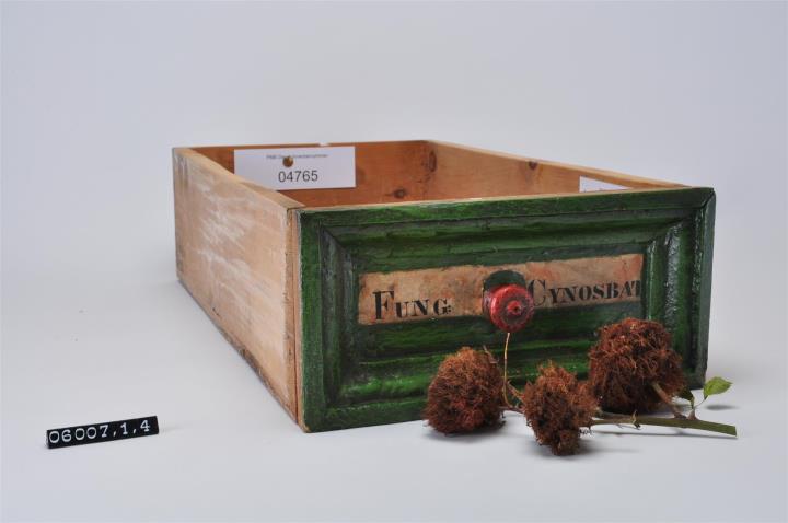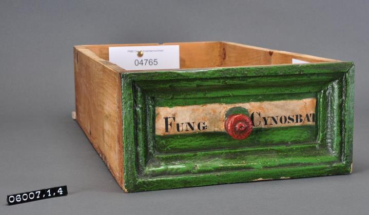 Schublade aus Nadelholz mit rotem Knauf und profilierter Vorderseite. Profil aufgeleimt und mit Holznägeln gesichert. Gezinkte Verbindungen (Schwalbenschwanzverbindung). Boden angeleimt und ebenfalls mit Holznägeln gesichert. Vorderfront grün mit aufgeklebter Papiersignatur. Enthält Hagebuttenschwamm, Rosenschwamm.