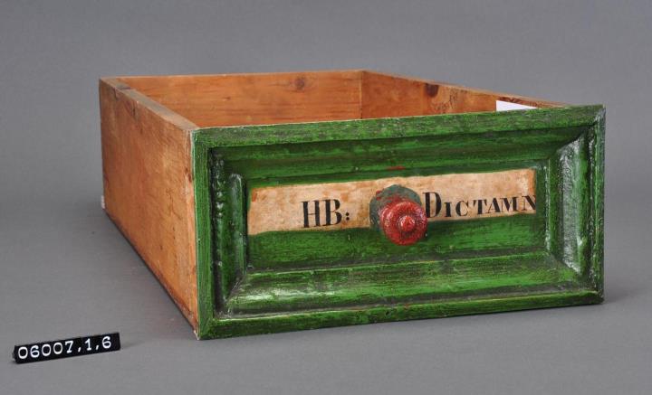 Schublade aus Nadelholz mit rotem Knauf und profilierter Vorderseite. Profil aufgeleimt und mit Holznägeln gesichert. Gezinkte Verbindungen (Schwalbenschwanzverbindung). Boden angeleimt und ebenfalls mit Holznägeln gesichert. Vorderfront grün mit aufgeklebter Papiersignatur. Enthielt: Weißer Diptam.