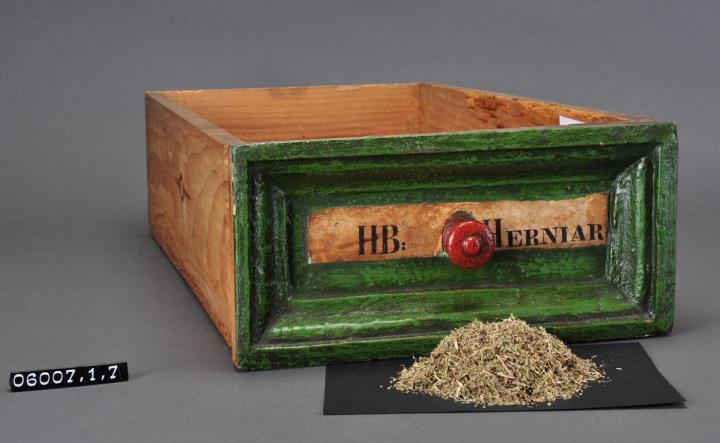 Schublade aus Nadelholz mit rotem Knauf und profilierter Vorderseite. Profil aufgeleimt und mit Holznägeln gesichert. Gezinkte Verbindungen (Schwalbenschwanzverbindung). Boden angeleimt und ebenfalls mit Holznägeln gesichert. Vorderfront grün mit aufgeklebter Papiersignatur. Enthält Bruchkraut geschnitten.