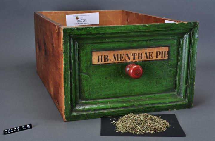 Schublade aus Nadelholz mit rotem Knauf und profilierter Vorderseite. Profil aufgeleimt und mit Holznägeln gesichert. Gezinkte Verbindungen (Schwalbenschwanzverbindung). Boden angeleimt und ebenfalls mit Holznägeln gesichert. Vorderfront grün mit aufgeklebter, schwarz umrandeter, bräunlicher Papiersignatur. Enthält Pfefferminze geschnitten.