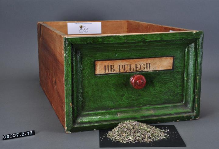 Schublade aus Nadelholz mit rotem Knauf und profilierter Vorderseite. Profil aufgeleimt und mit Holznägeln gesichert. Gezinkte Verbindungen (Schwalbenschwanzverbindung). Boden angeleimt und ebenfalls mit Holznägeln gesichert. Vorderfront grün mit aufgeklebter, schwarz umrandeter, bräunlicher Papiersignatur. Enthält Poleiminze geschnitten.