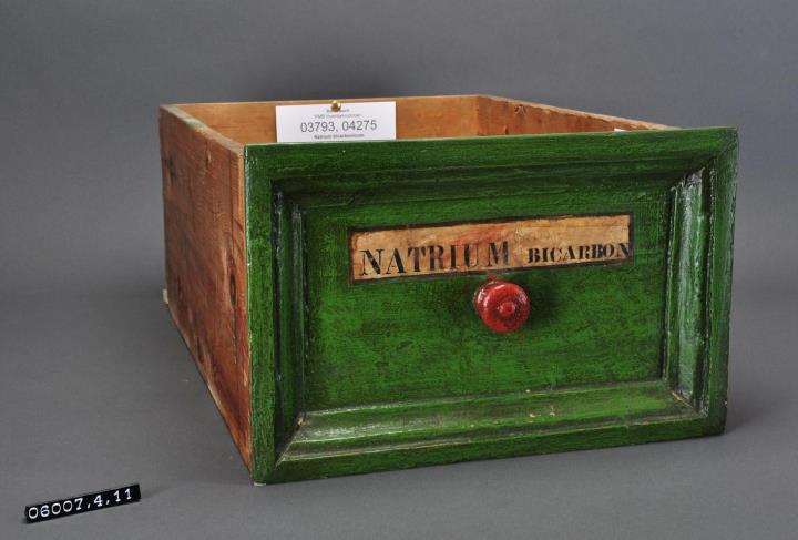 Schublade aus Nadelholz mit rotem Knauf und profilierter Vorderseite. Profil aufgeleimt und mit Holznägeln gesichert. Gezinkte Verbindungen (Schwalbenschwanzverbindung). Boden angeleimt und ebenfalls mit Holznägeln gesichert. Vorderfront grün mit aufgeklebter, schwarz umrandeter, bräunlicher Papiersignatur. Ohne Inhalt.