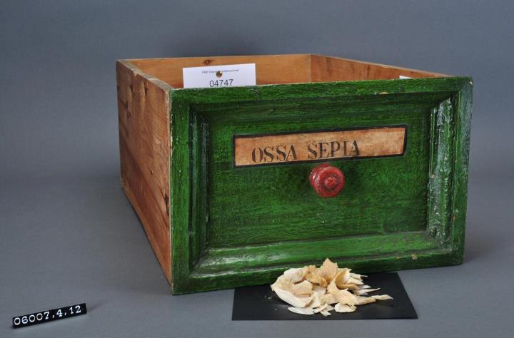 Schublade aus Nadelholz mit rotem Knauf und profilierter Vorderseite. Profil aufgeleimt und mit Holznägeln gesichert. Gezinkte Verbindungen (Schwalbenschwanzverbindung). Boden angeleimt und ebenfalls mit Holznägeln gesichert. Vorderfront grün mit aufgeklebter, schwarz umrandeter, bräunlicher Papiersignatur. Seitlich an der Außenwand altes Preisschild. Enthält Sepiaschalen, Sepiaknochen, weißes Fischbein in Bruchstücken.