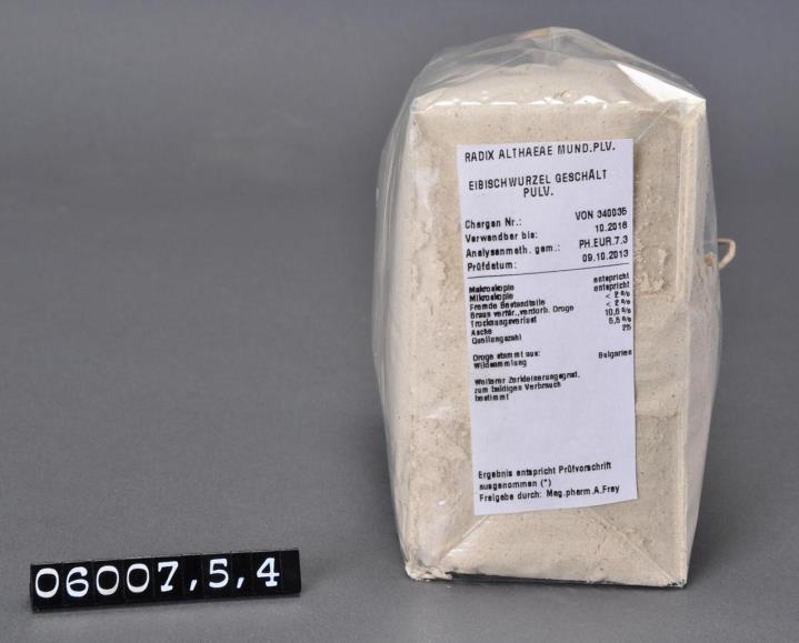 Schublade aus Nadelholz mit rotem Knauf und profilierter Vorderseite. Profil aufgeleimt und mit Holznägeln gesichert. Gezinkte Verbindungen (Schwalbenschwanzverbindung). Boden angeleimt und ebenfalls mit Holznägeln gesichert. Vorderfront grün mit aufgeklebter, schwarz umrandeter, bräunlicher Papiersignatur. Enthält Eibischwurzel-Pulver, fein gepulvert.