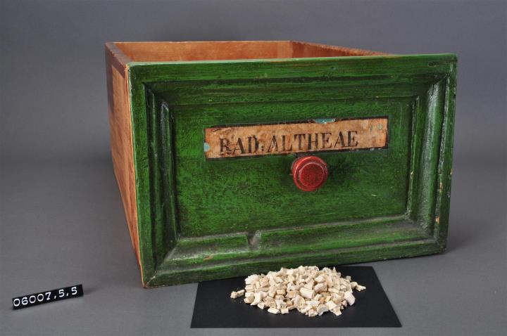 Schublade aus Nadelholz mit rotem Knauf und profilierter Vorderseite. Profil aufgeleimt und mit Holznägeln gesichert. Gezinkte Verbindungen (Schwalbenschwanzverbindung). Boden angeleimt und ebenfalls mit Holznägeln gesichert. Vorderfront grün mit aufgeklebter, schwarz umrandeter, bräunlicher Papiersignatur. Enthält Eibischwurzel, geschnitten.