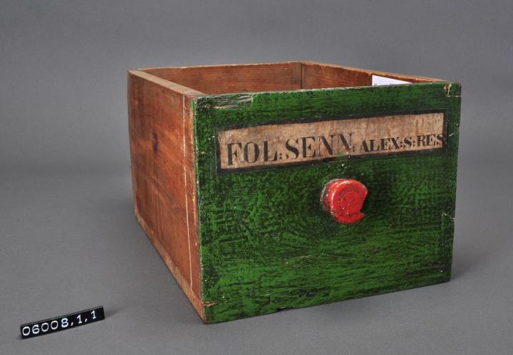 Schublade aus Nadelholz mit rotem, teilweise abgesprungenem Knauf; gezinkte Verbindungen (Schwalbenschwanzverbindung). Durchgehender Boden angeleimt, und mit Holznägeln gesichert. Vorderfront grün mit aufgeklebter Papiersignatur. Ohne Inhalt.