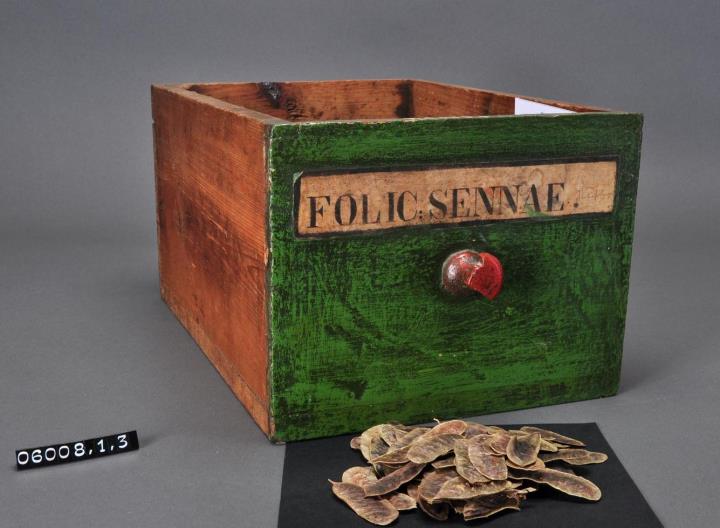 Schublade aus Nadelholz mit rotem, teilweise abgesprungenem Knauf; gezinkte Verbindungen (Schwalbenschwanzverbindung). Durchgehender Boden angeleimt, und mit Holznägeln gesichert. Vorderfront grün mit aufgeklebter Papiersignatur. Enthält Sennes-Schoten, auch Mutterblätter genannt als Ganzdroge.