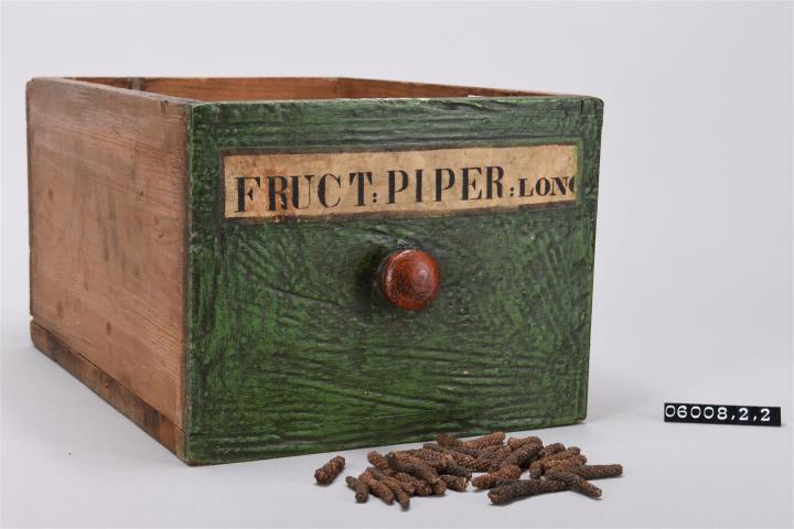 Schublade aus Nadelholz mit rotem Knauf; gezinkte Verbindungen (Schwalbenschwanzverbindung). Durchgehender Boden angeleimt, und mit Holznägeln gesichert. Vorderfront grün mit aufgeklebter Papiersignatur. Enthält Stangenpfeffer.