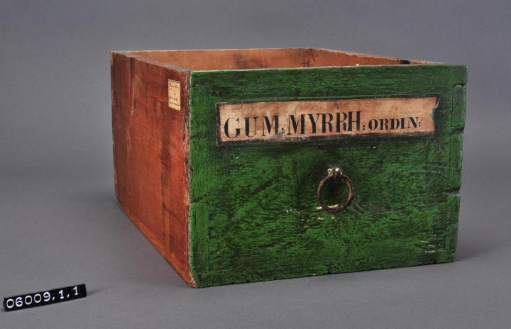 Schublade aus Nadelholz mit handgeschmiedetem Ring als Knauf. Ring ist an einer Öse befestigt, welche an der Schubladeninnenseite umgeschlagen wurde. Gezinkte Verbindungen (Schwalbenschwanzverbindung). Durchgehender Boden angeleimt, und mit Holznägeln gesichert. Vorderfront grün maserierend angemalen. Aufgeklebte, mit Signierapparat bedruckte, Papiersignatur. Enthält Myrrhe, granuliert.