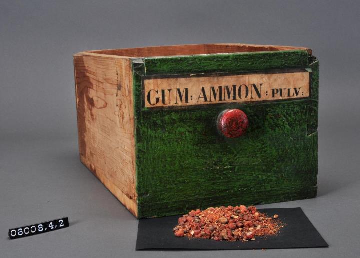 Schublade aus Nadelholz mit rotem Knauf; gezinkte Verbindungen (Schwalbenschwanzverbindung). Durchgehender Boden angeleimt, und mit Holznägeln gesichert. Vorderfront grün mit aufgeklebter Papiersignatur. Enthält Ammoniakgummi , zerstoßen.