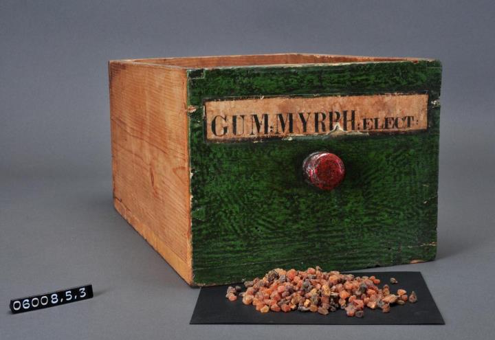 Schublade aus Nadelholz mit rotem Knauf; gezinkte Verbindungen (Schwalbenschwanzverbindung). Durchgehender Boden angeleimt, und mit Holznägeln gesichert. Vorderfront grün mit aufgeklebter Papiersignatur. Enthält Myrrhe in Tropfen.