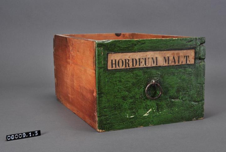 Schublade aus Nadelholz mit handgeschmiedetem Ring als Knauf. Ring ist an einer Öse befestigt, welche an der Schubladeninnenseite umgeschlagen wurde. Gezinkte Verbindungen (Schwalbenschwanzverbindung). Durchgehender Boden angeleimt, und mit Holznägeln gesichert. Vorderfront grün maserierend angemalen. Aufgeklebte, mit Signierapparat bedruckte, Papiersignatur. Enthielt Gerstenmalz.