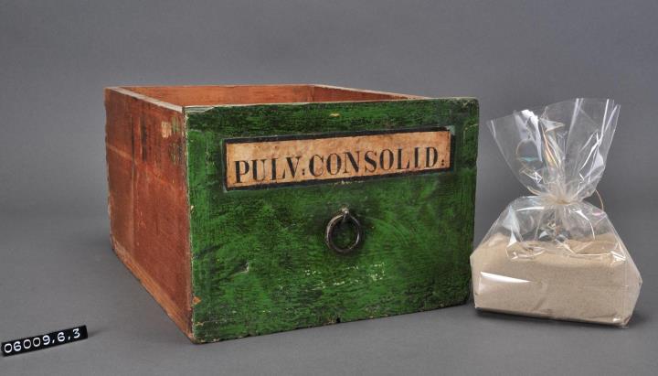 Schublade aus Nadelholz mit handgeschmiedetem Ring als Knauf. Ring ist an einer Öse befestigt, welche an der Schubladeninnenseite umgeschlagen wurde. Gezinkte Verbindungen (Schwalbenschwanzverbindung). Durchgehender Boden angeleimt, und mit Holznägeln gesichert. Vorderfront grün maserierend angemalen. Aufgeklebte, mit Signierapparat bedruckte, Papiersignatur. Enthält Beinwellwurzel-Pulver.