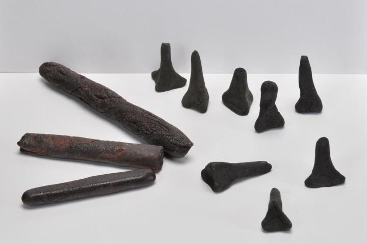 Schublade aus Nadelholz mit rotem Knauf. Vorderfront grün maserierend angemalen. Gezinkte Verbindungen (Schwalbenschwanzverbindung). Durchgehender Boden angeleimt und mit Holznägeln gesichert. Aufgeklebte, mit Signierapparat bedruckte, seitlich zugeschnittene Papiersignatur. Enthält Räucherkerzen in Stangen und pyramidenförmig.
