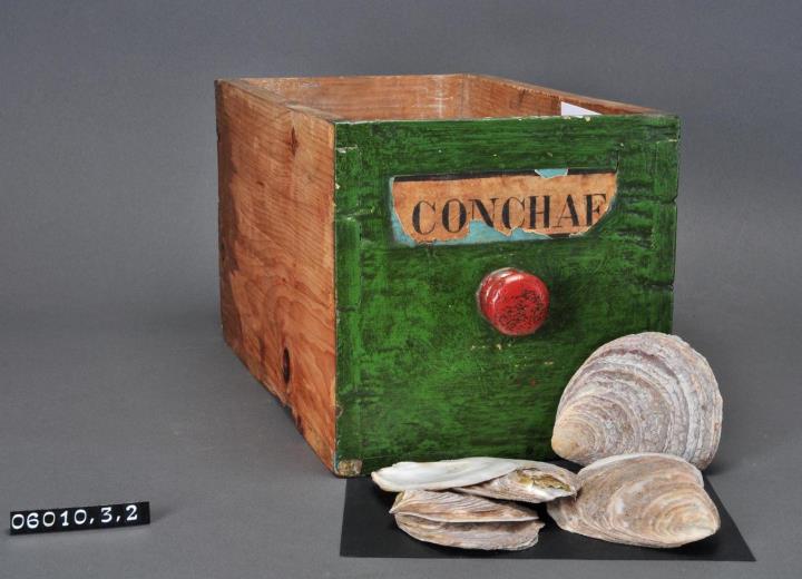 Schublade aus Nadelholz mit rotem Knauf. Vorderfront grün maserierend angemalen. Gezinkte Verbindungen (Schwalbenschwanzverbindung). Durchgehender Boden angeleimt und mit Holznägeln gesichert. Aufgeklebte, mit Signierapparat bedruckte, seitlich zugeschnittene Papiersignatur. Enthält ganze Muschelschalen.