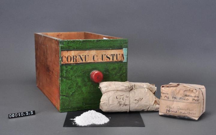 Schublade aus Nadelholz mit rotem Knauf. Vorderfront grün maserierend angemalen. Gezinkte Verbindungen (Schwalbenschwanzverbindung). Durchgehender Boden angeleimt und mit Holznägeln gesichert. Aufgeklebte, mit Signierapparat bedruckte, seitlich zugeschnittene Papiersignatur. Enthält Gebranntes Hirschhorn in pulverform, ein Päckchen mit Pulver 340g (Friedrich Peer), und gebrannte Hornspitzen. "Nach Bericht" geschrieben von Ignaz Peer II.