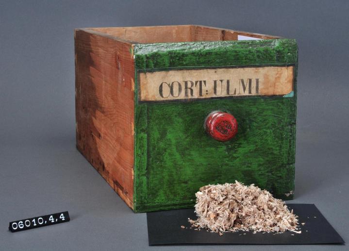 Schublade aus Nadelholz mit rotem Knauf. Vorderfront grün maserierend angemalen. Gezinkte Verbindungen (Schwalbenschwanzverbindung). Durchgehender Boden angeleimt und mit Holznägeln gesichert. Aufgeklebte, mit Signierapparat bedruckte, seitlich zugeschnittene Papiersignatur. Enthält Ulmenrinde, geschnitten.