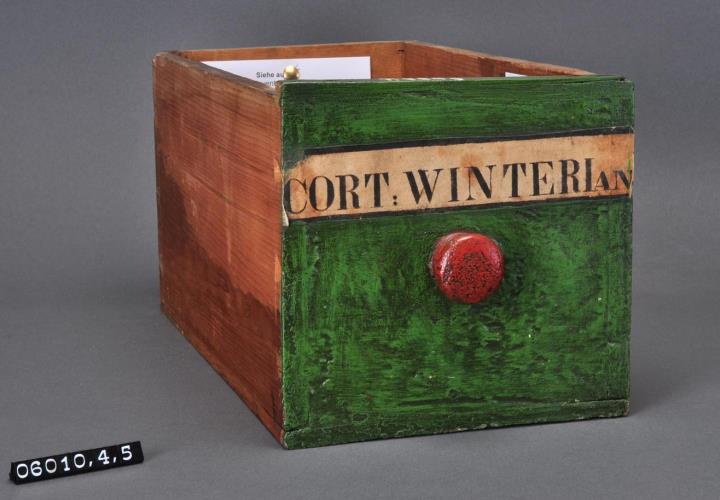 Schublade aus Nadelholz mit rotem Knauf. Vorderfront grün maserierend angemalen. Gezinkte Verbindungen (Schwalbenschwanzverbindung). Durchgehender Boden angeleimt und mit Holznägeln gesichert. Aufgeklebte, mit Signierapparat bedruckte, seitlich zugeschnittene Papiersignatur. Enthielt Echte Winterrinde, Weißer Zimt, Weißer Canell-Baum.