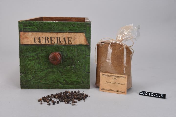 Schublade aus Nadelholz mit rotem Knauf. Vorderfront grün maserierend angemalen. Gezinkte Verbindungen (Schwalbenschwanzverbindung). Durchgehender Boden angeleimt und mit Holznägeln gesichert. Aufgeklebte, mit Signierapparat bedruckte, seitlich zugeschnittene Papiersignatur. Enthält Kubeben, Schwindelkörner, Kubebenpfeffer, Schwanzpfeffer als Ganzdroge.