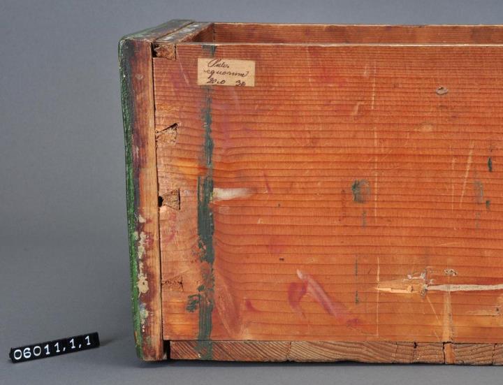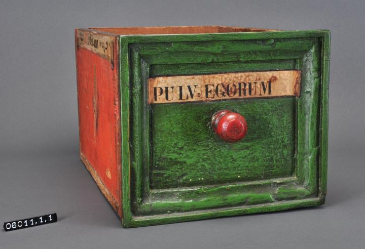 Schublade aus Nadelholz mit rotem Knauf. Profilierte Vorderfront, grün maserierend angemalen. Gezinkte Verbindungen (Schwalbenschwanzverbindung). Seitenteil aus älterer, rot angemalener, Schubladenvorderfront. Boden angeleimt und mit Holznägeln gesichert. Aufgeklebte, mit Signierapparat bedruckte Papiersignatur. Enthält eine Kartonschachtel von Eisenht & Jarolim, Wien, für Pferdepulver.