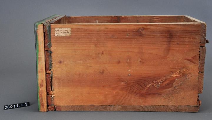 Schublade aus Nadelholz mit rotem Knauf. Profilierte Vorderfront, grün maserierend angemalen. Gezinkte Verbindungen (Schwalbenschwanzverbindung). Seitenteil aus älterer, rot angemalener, Schubladenvorderfront. Boden angeleimt und mit Holznägeln gesichert. Aufgeklebte, mit Signierapparat bedruckte Papiersignatur. Enthält Meisterwurz-Pulver.