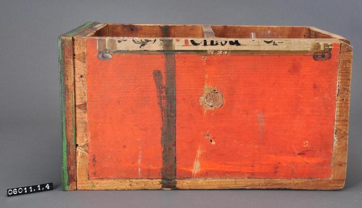 Schublade aus Nadelholz mit rotem Knauf. Profilierte Vorderfront, grün maserierend angemalen. Gezinkte Verbindungen (Schwalbenschwanzverbindung). Innen mit Abteiler aus Holz. Seitenteil aus älterer, rot angemalener, Schubladenvorderfront. Boden angeleimt und mit Holznägeln gesichert. Aufgeklebte, mit Signierapparat bedruckte Papiersignatur. Enthält Wacholderbeeren-Pulver.