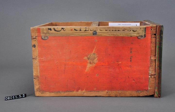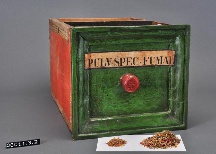 Schublade aus Nadelholz mit rotem Knauf. Profilierte Vorderfront, grün maserierend angemalen. Gezinkte Verbindungen (Schwalbenschwanzverbindung). Mittiger Abteiler aus Holz. Linkes Seitenteil aus älterer, rot angemalener, Schubladenvorderfront. Boden angeleimt und mit Holznägeln gesichert. Aufgeklebte, mit Signierapparat bedruckte Papiersignatur. Enthält Räuchermischung gepulvert in zwei Qualiäten: "ordinar." und "elect.".