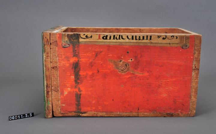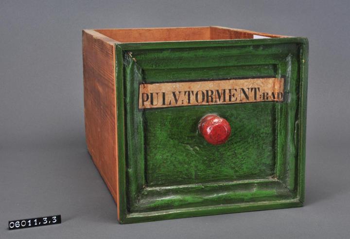 Schublade aus Nadelholz mit rotem Knauf. Profilierte Vorderfront, grün maserierend angemalen. Gezinkte Verbindungen (Schwalbenschwanzverbindung). Rechtes Seitenteil aus älterer, rot angemalener, Schubladenvorderfront. Boden angeleimt und mit Holznägeln gesichert. Aufgeklebte, mit Signierapparat bedruckte Papiersignatur. Enthält Blutwurz-Pulver.