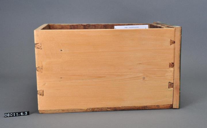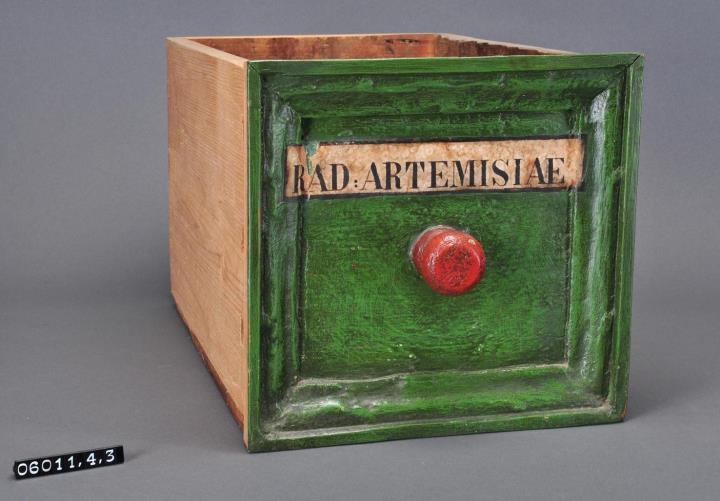 Schublade aus Nadelholz mit rotem Knauf. Profilierte Vorderfront, grün maserierend angemalen. Gezinkte Verbindungen (Schwalbenschwanzverbindung). Linkes Seitenteil aus älterer, rot angemalener, Schubladenvorderfront, wurde ca 1976 entnommen. Boden angeleimt und mit Holznägeln gesichert. Aufgeklebte, mit Signierapparat bedruckte Papiersignatur. Enthielt Beifuß-Wurzel.