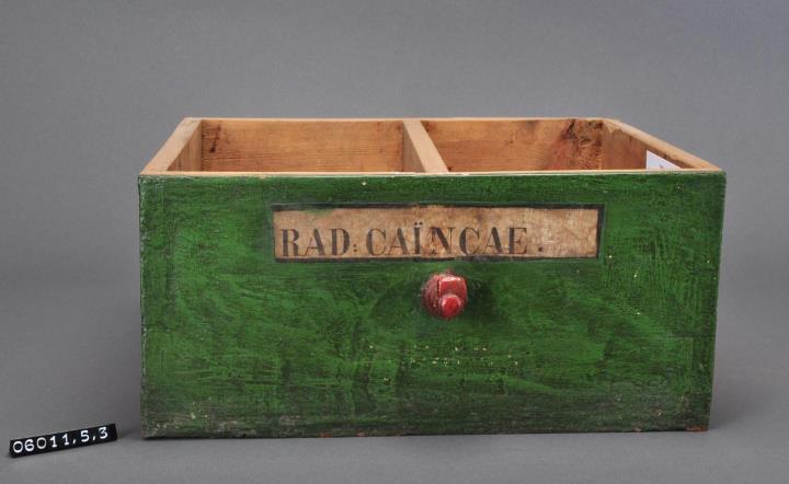 Schublade aus Nadelholz mit rotem, teilweise abgeschlagenem Knauf. Glatte Vorderfront grün maserierend angemalen. Gezinkte Verbindungen (Schwalbenschwanzverbindung). Mittiger Holzabteiler. Durchgehender Boden angeleimt und mit Holznägeln gesichert. Aufgeklebte, mit Signierapparat bedruckte Papiersignatur. Enthielt Cainacawurzel.