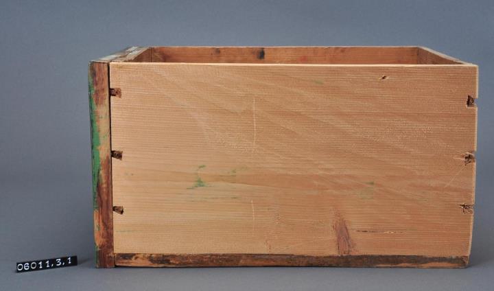 Schublade aus Nadelholz mit rotem Knauf. Profilierte Vorderfront, grün maserierend angemalen. Gezinkte Verbindungen (Schwalbenschwanzverbindung). Rechtes Seitenteil aus älterer, rot angemalener, Schubladenvorderfront wurde ca 1976 entnommen. Boden angeleimt und mit Holznägeln gesichert. Aufgeklebte, mit Signierapparat bedruckte Papiersignatur. Enthält Sanikel-Pulver, rob gepulvert.
