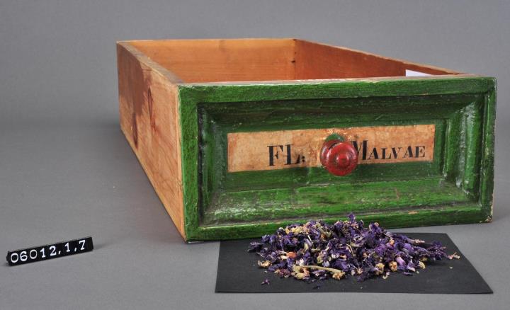 Schublade aus Nadelholz mit rotem Knauf und profilierter Vorderseite. Profil aufgeleimt und mit Holznägeln gesichert. Gezinkte Verbindungen (Schwalbenschwanzverbindung). Boden angeleimt und ebenfalls mit Holznägeln gesichert. Vorderfront grün, mit aufgeklebter, schwarz umrandeter, bräunlicher Papiersignatur. Enthält Malvenblüten.