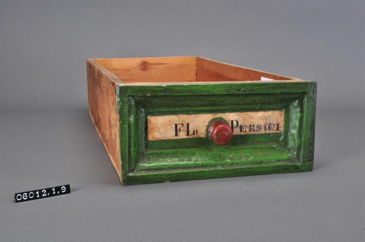 Schublade aus Nadelholz mit rotem Knauf und profilierter Vorderseite. Profil aufgeleimt und mit Holznägeln gesichert. Gezinkte Verbindungen (Schwalbenschwanzverbindung). Boden angeleimt und ebenfalls mit Holznägeln gesichert. Vorderfront grün, mit aufgeklebter, schwarz umrandeter, bräunlicher Papiersignatur. Enthält Pfirsichblüten.