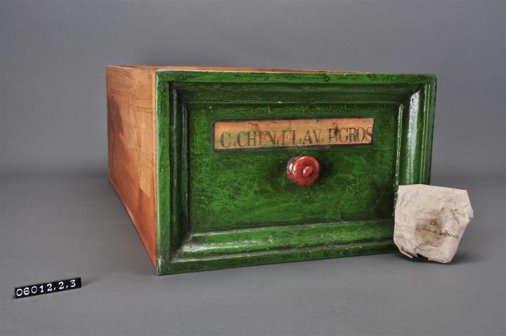 Schublade aus Nadelholz mit rotem Knauf und profilierter Vorderseite. Profil aufgeleimt und mit Holznägeln gesichert. Gezinkte Verbindungen (Schwalbenschwanzverbindung). Boden angeleimt und ebenfalls mit Holznägeln gesichert. Vorderfront grün, mit aufgeklebter, schwarz umrandeter, bräunlicher Papiersignatur. Enthält Gelbe Chinarinde Pulver in historischem Tütchen.