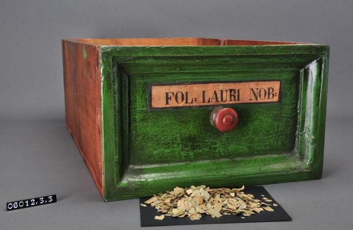 Schublade aus Nadelholz mit rotem Knauf und profilierter Vorderseite. Profil aufgeleimt und mit Holznägeln gesichert. Gezinkte Verbindungen (Schwalbenschwanzverbindung). Boden angeleimt und ebenfalls mit Holznägeln gesichert. Vorderfront grün, mit aufgeklebter, schwarz umrandeter, bräunlicher Papiersignatur. Preisschild auf Oberseite der Vorderfront. Enthält Lorbeer-Blätter, geschnitten.